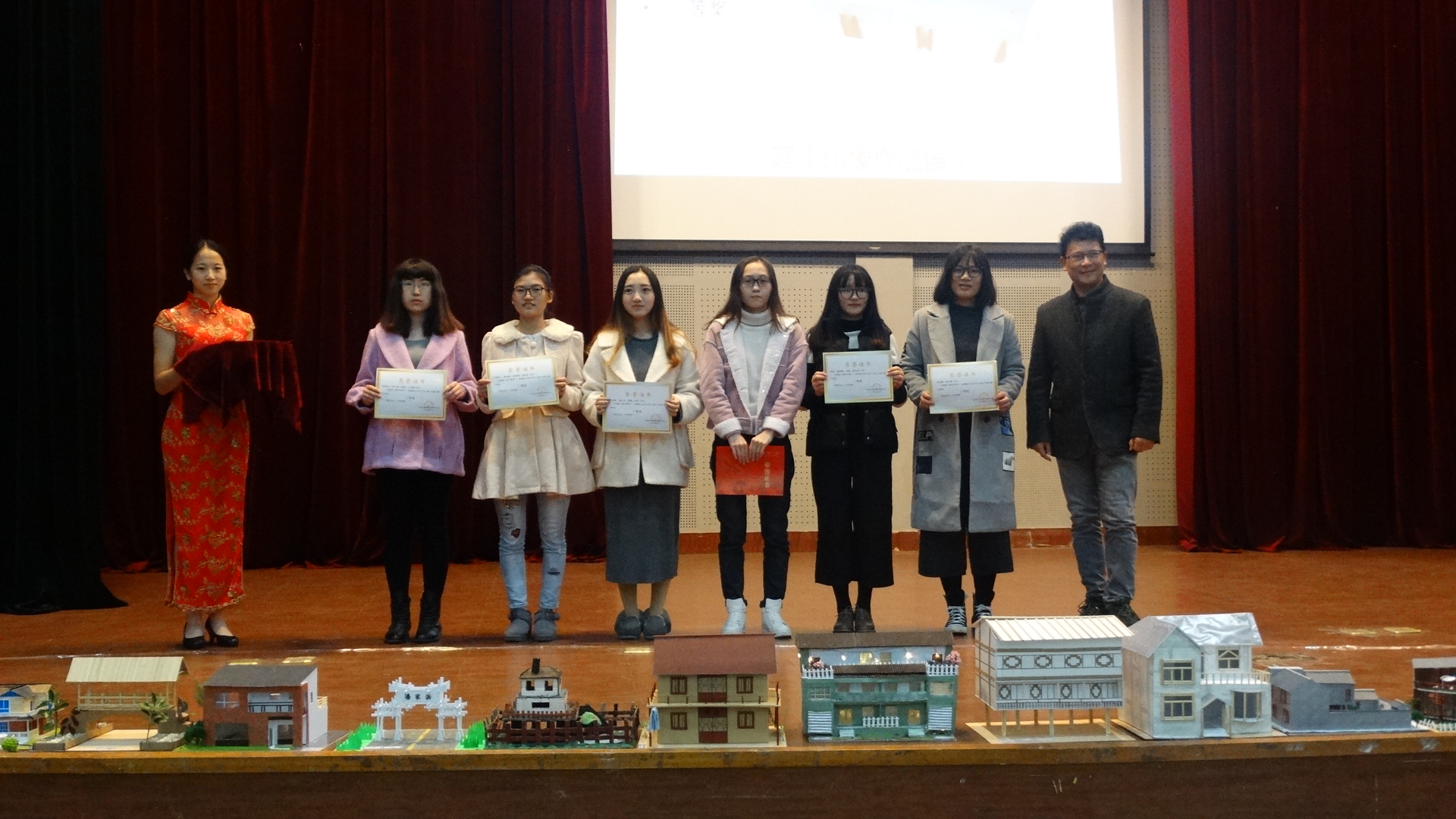 最后是美丽乡村颁奖环节,由顾晴女士和王卓琦女士为这些获奖队伍颁奖。舞台上展示了许多房屋建设模型,是建工学子用努力、用汗水、用智慧换来的成果,是对专业的理解,是智慧的结晶。颁奖过后,是受邀获奖同学进行作品介绍,黄金萍同学介绍了她们的小组成员及分工、作品的各方面细节、作评的具体制作过程。并详细地介绍了制作过程中的具体思路与困难,并点明了作品中的不足之处。