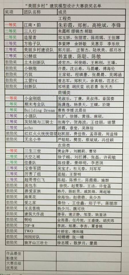 各专业内开展以“美丽乡村”计划为题的建筑模型设计比赛。本次比赛中费锦红老师、黄殿武老师、王辉老师、吴祥松老师、华昕若老师、吕秀杰老师、金荣科老师、庄天文老师、周振纲老师、彭耀中老师、李嘉老师以及孙德发老师为参赛作品进行打分。同学们的作品分为三类进行评奖:A:工程类;B:商业类;C:农宅类。