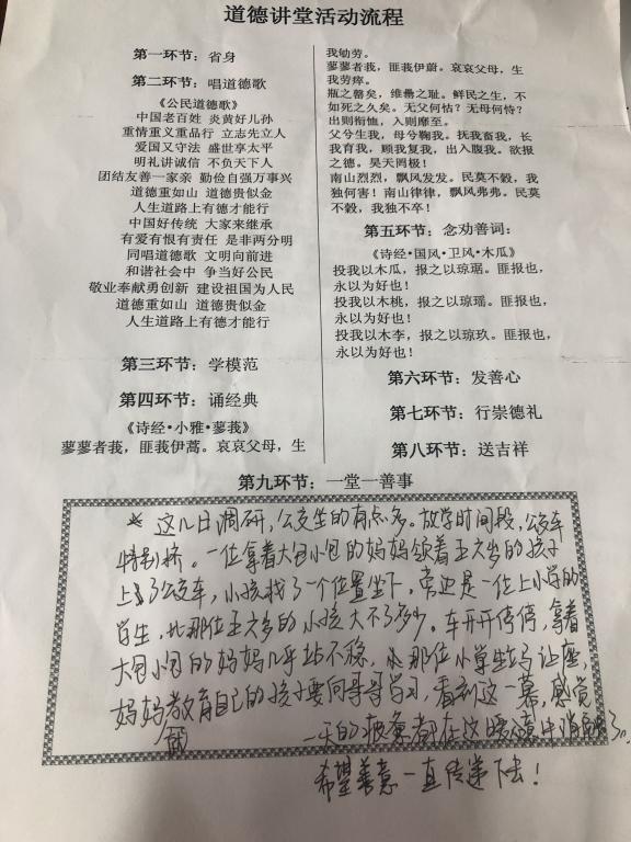 本次道德讲堂分为“省身”、“唱道德歌”、“学模范讲故事”、“诵经典”、“念劝善词”、“发善心”、“行崇德礼”、“送吉祥”、“一堂一善事”9个环节。