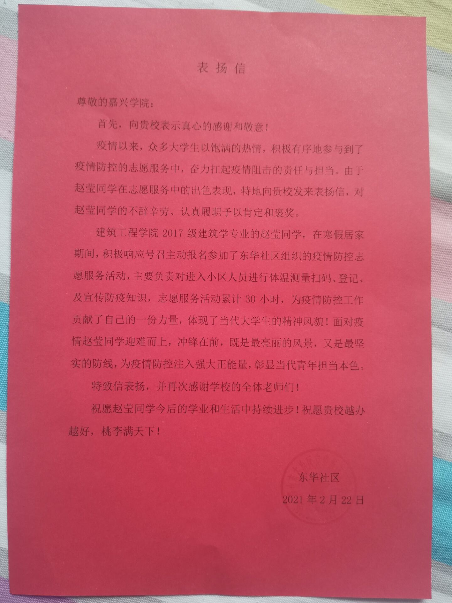 建筑172赵莹同学、工管181许涵茜同学、建筑192张峰源及高磊同学、建环201汪济磊同学、建筑202任学渊同学积极主动加入疫情防控志愿服务队伍、为当地疫情防控工作无私奉献提出了感谢和表扬,并对草莓视频