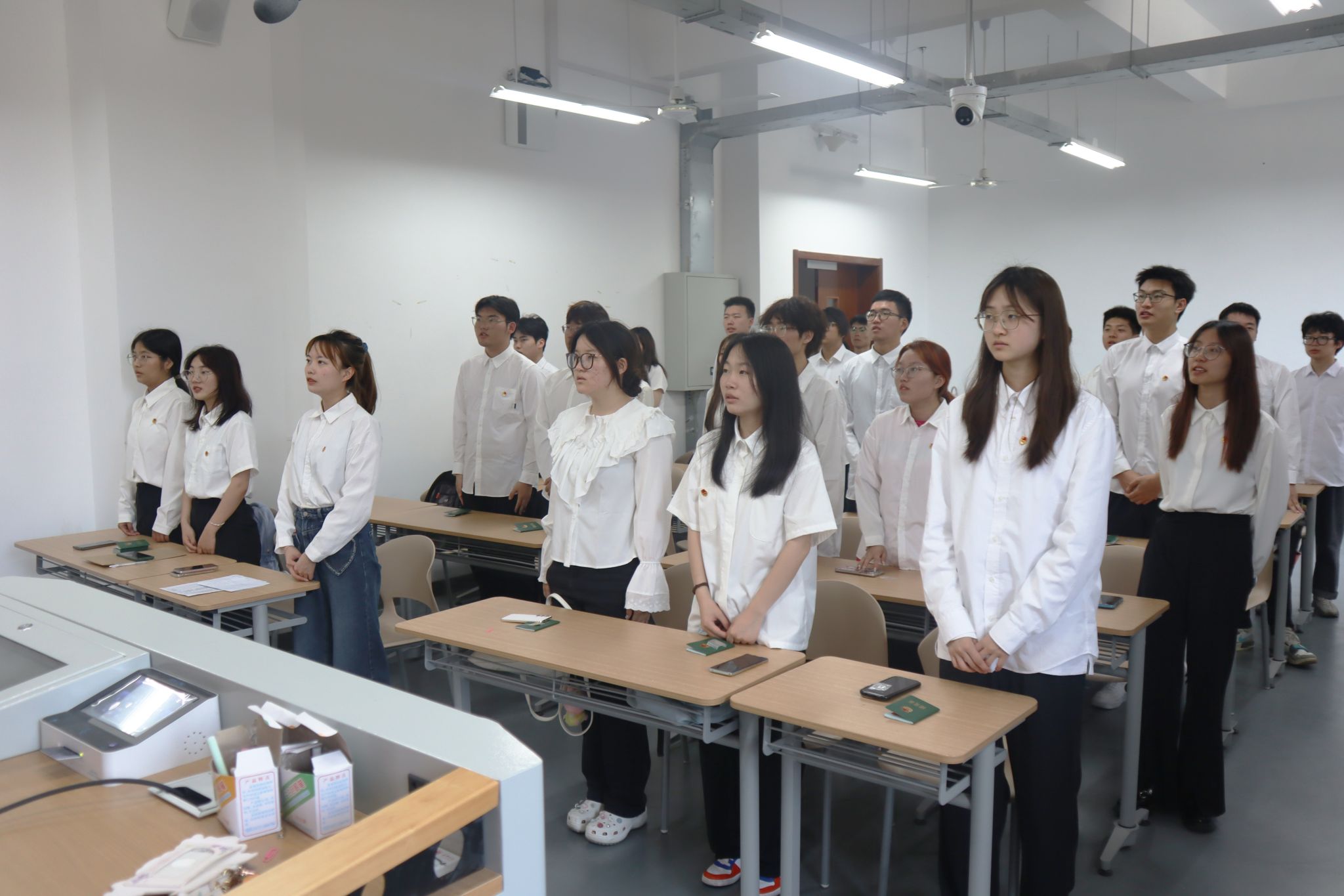 新团员们整齐地站在团旗前,庄严宣誓。他们的声音铿锵有力,响彻整个教室,展现了新一代团员的坚定信念和决心。