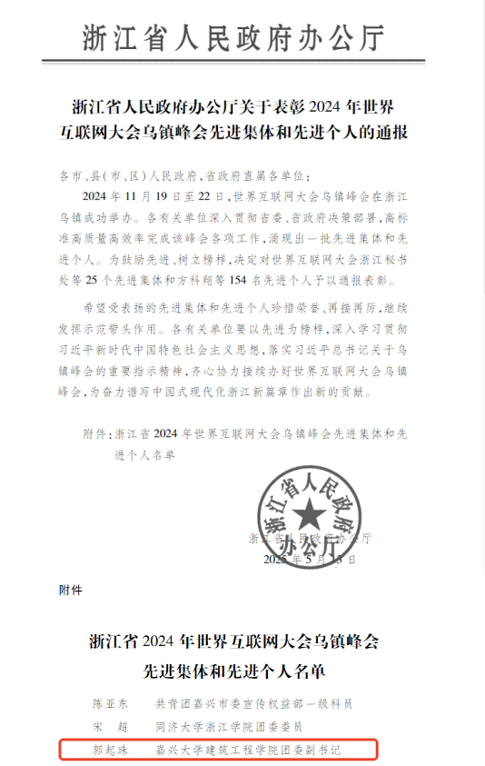 团委副书记郭起珠凭借其在大会志愿服务工作中的优秀表现,荣获“2024年世界互联网大会乌镇峰会先进个人”称号。