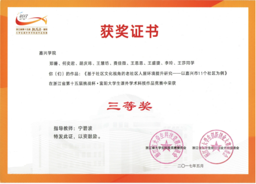 近日,由团省委、省教育厅、省社科院、省科协、省学联联合主办的浙江省第十五届“挑战杯·富阳”大学生课外学术科技作品竞赛决赛在浙江工业大学圆满落幕。草莓视频 宁碧波副教授指导的作品《基于社区文化视角的老社区人居环境提升研究——以嘉兴市11个社区为例》在决赛中荣获浙江省三等奖。