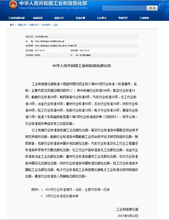 据工业和信息化部政府网站最新公告,工业和信息化部批准发布《电动汽车用动力蓄电池箱通用要求》等652项行业标准。其中, 由嘉兴学院刘红飞教授负责完成的《预拌砂浆用保水剂》(JC/T 2389-2017)、《水泥基泡沫保温板专用砂浆》(JC/T 2390-2017)等2项建材行业标准,上述2项标准将于2017年10月1日起实施。