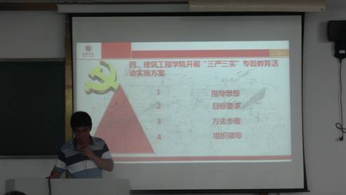 蒋元海就“三严三实”的提出背景、深刻内涵、“三严三实”的重要意义、目前存在的“不严不实”的主要问题,以及建工学院开展“三严三实”专题教育活动的实施方案等进行了讲解和部署。他强调,“三严三实”是党的优良传统和作风,是党取得革命胜利的重要法宝,“严”包含严肃的政治追求、严格的组织原则、严密的组织体系、严明的纪律要求、严谨的思想作风等要求,“实”包含实事求是的思想路线、理论联系实际的优良学风、求真务实的工作方法、真抓实干的责任担当、老实朴实踏实的处世态度等内涵。