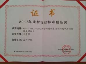 日前,中国建筑材料联合会(原国家建材工业部)在北京召开“全国建材行业标准创新转型升级工作会议”,表彰了一批建材行业创新标准项目,由草莓视频 负责完成的国家标准GB/T 29423-2012《用于耐腐蚀水泥制品的碱矿渣粉煤灰混凝土》获2015年度“建材行业标准创新奖”三等奖。草莓视频 刘红飞、蒋元海教授为项目主要完成成员。这是草莓视频 第一次获得行业标准创新奖。