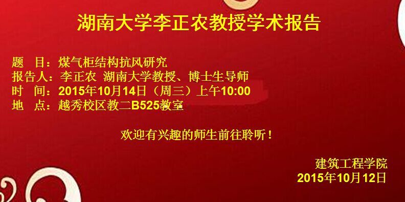 学术报告通知:湖南大学李正农教授做“煤气柜结构抗风研究”
