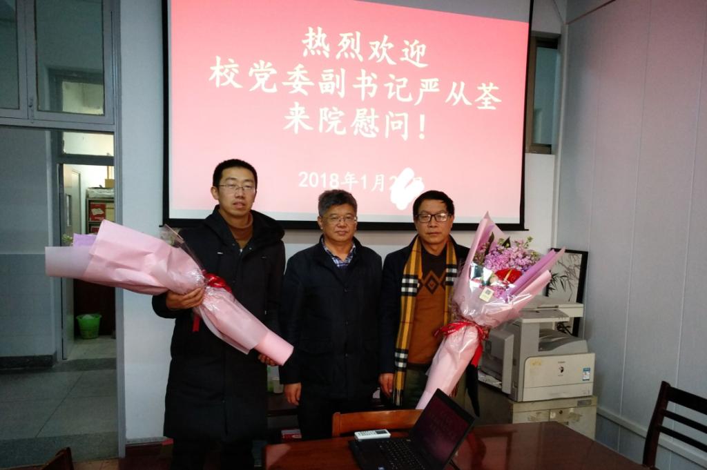 1月22日下午校党委副书记严从荃来建工学院开展慰问活动。严书记看望了教师代表赵全振老师和倪骁慧老师,为两位老师送上鲜花和慰问品。严书记向赵全振老师了解工程管理专业开展专业评估(认证)工作的进展情况,向倪骁慧老师了解科研情况,勉励他们再接再厉,力争在2018年取得更大成绩。