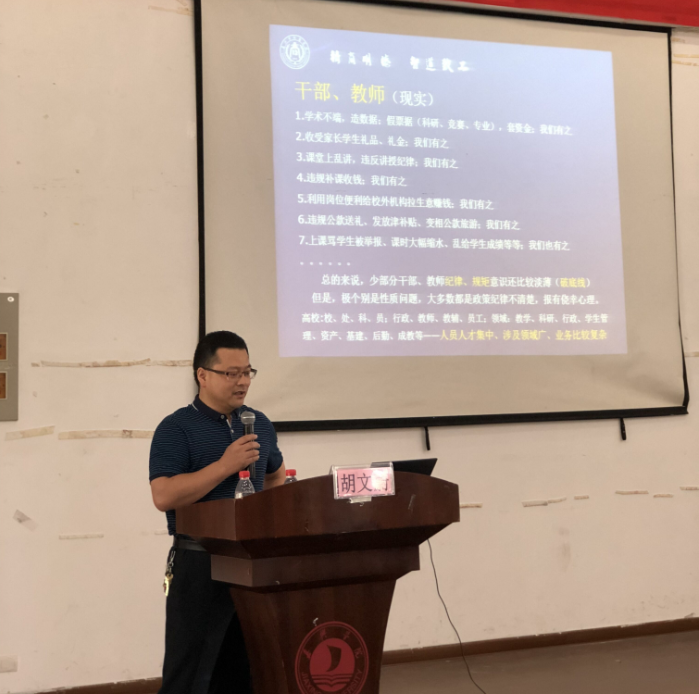 报告中,胡书记结合高校的特点和教师的岗位职责,梳理和分析了近年来省内和高校发生违纪违法情况的数据,列举了大量生动详实的案例。对高校干部、教师容易发生违纪行为的领域和情况作了介绍,对违纪行为的原因以及如何牢固树立自觉遵守规矩和纪律的意识作了分析。