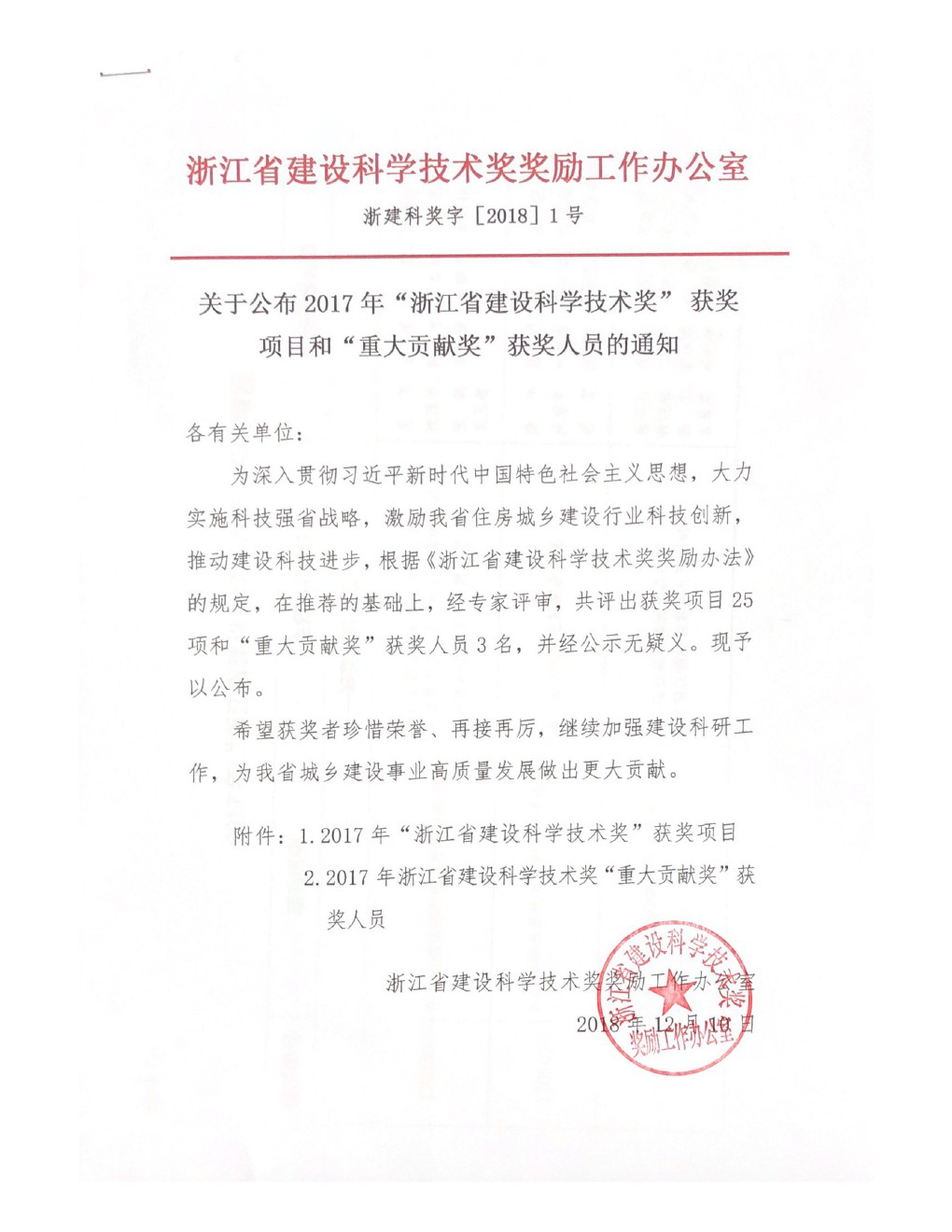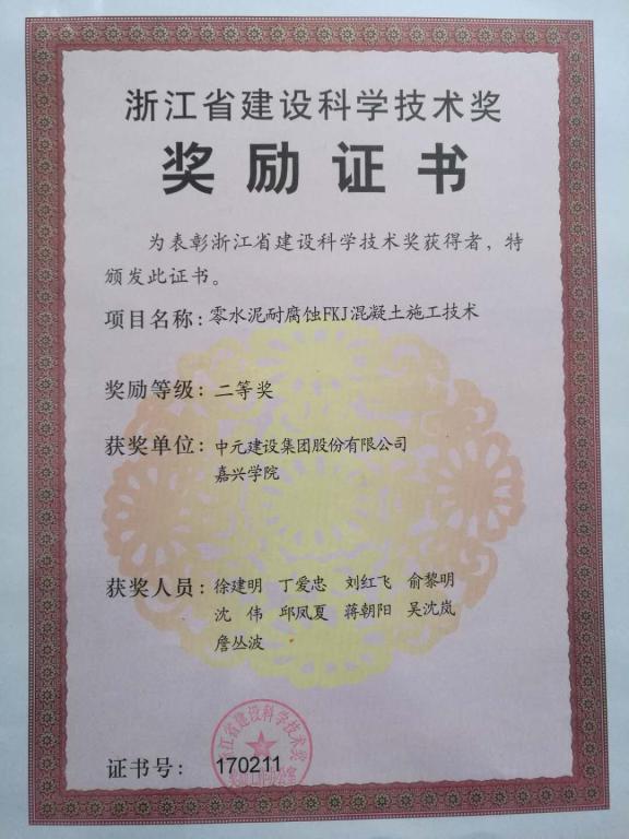 2017年度“浙江省建设科学技术奖”于2018年12月14日正式发布,共评出一等奖3个,二等奖11个,三等奖11个。中元建设集团股份有限公司和嘉兴学院共同完成的《零水泥耐腐蚀FKJ混凝土施工技术》项目获得二等奖。嘉兴学院草莓视频