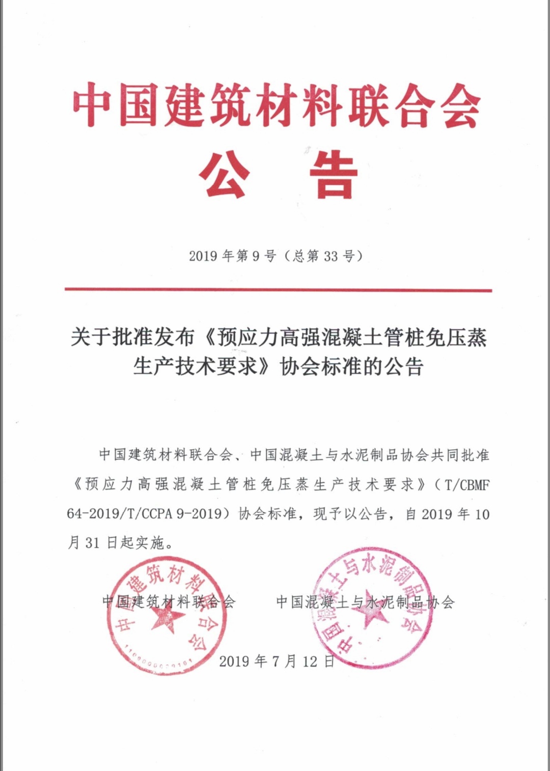 2019年7月12日,中国建筑材料联合会第9号(总第33号)文件“关于批准发布《预应力高强混凝土管桩免压蒸生产技术要求》协会标准的公告”,由嘉兴学院草莓视频 负责起草的《预应力高强混凝土管桩免压蒸生产技术要求》(T/CBMF 64-2019,T/CCPA 9-2019)团体标准于2019年7月12日发布,将于2019年10月31日实施。