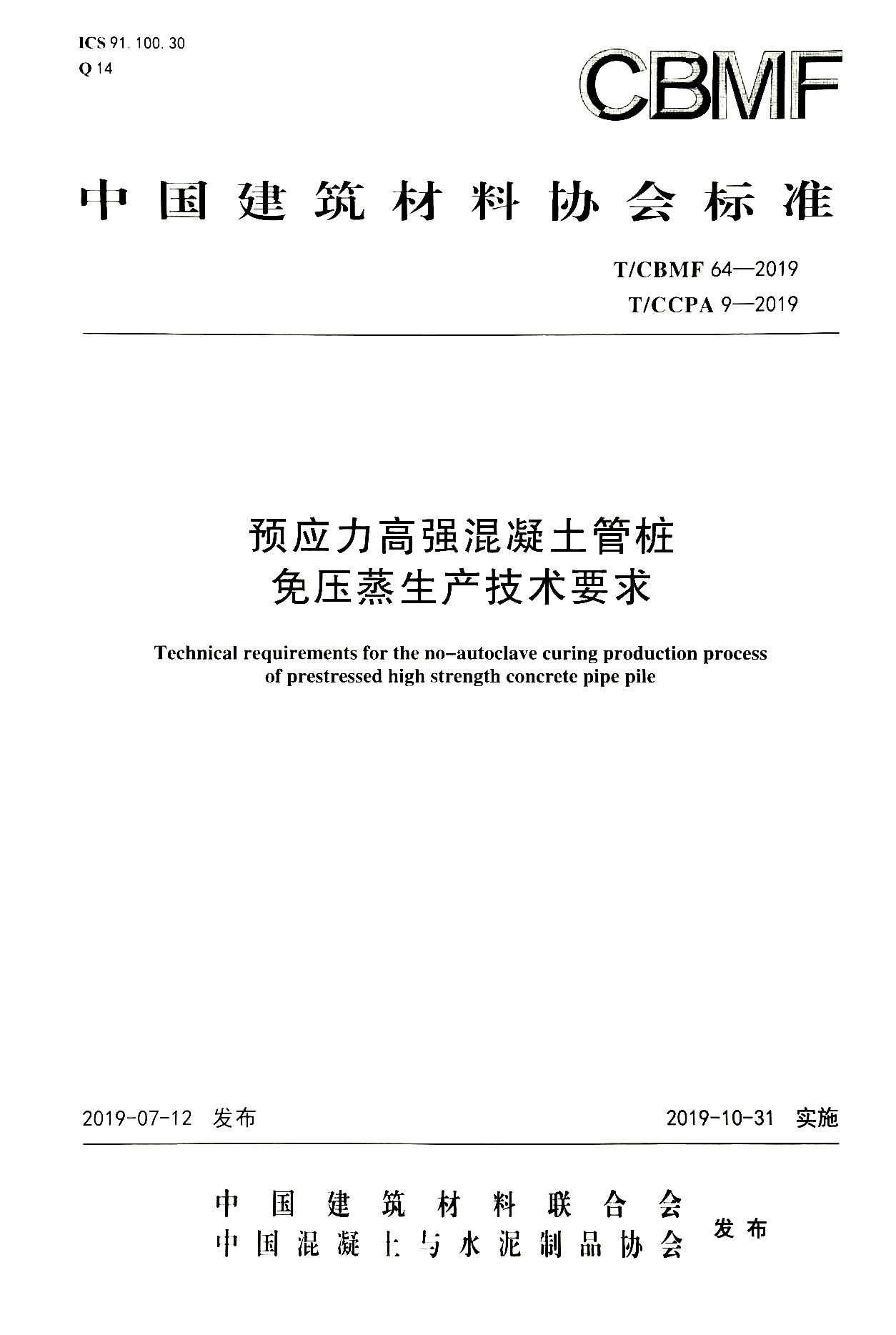 负责起草的《预应力高强混凝土管桩免压蒸生产技术要求》(T/CBMF 64-2019,T/CCPA 9-2019)团体标准于2019年7月12日发布,将于2019年10月31日实施。
