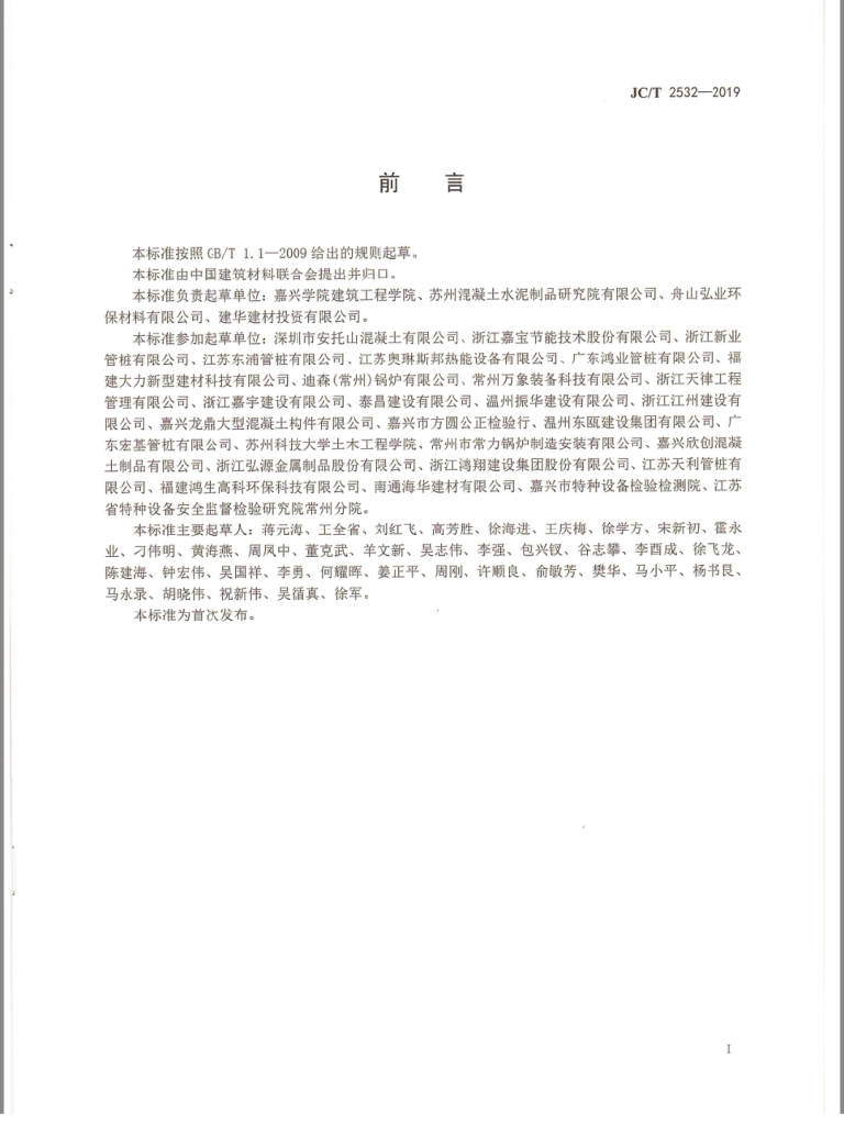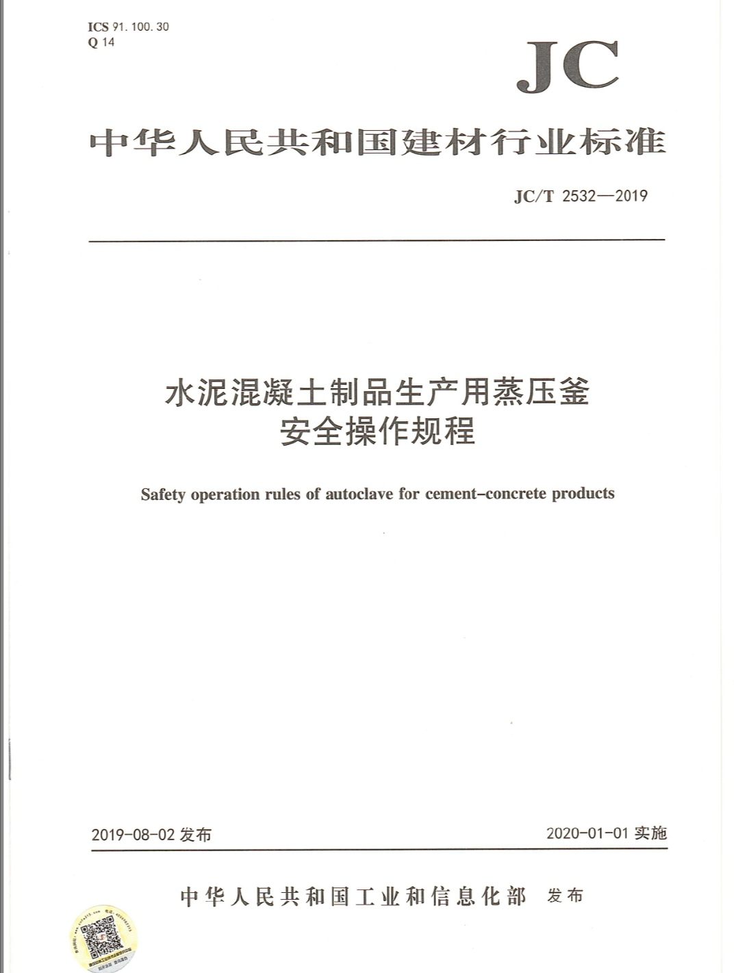 根据中华人民共和国工业和信息化部公告2019年第29号公告,由嘉兴学院蒋元海教授负责起草的《水泥混凝土制品生产用蒸压釜安全操作规程》为中华人民共和国建材行业标准,标准编号为JC/T 2532-2019,自2019年 8月2日发布,2020年1月1日实施。