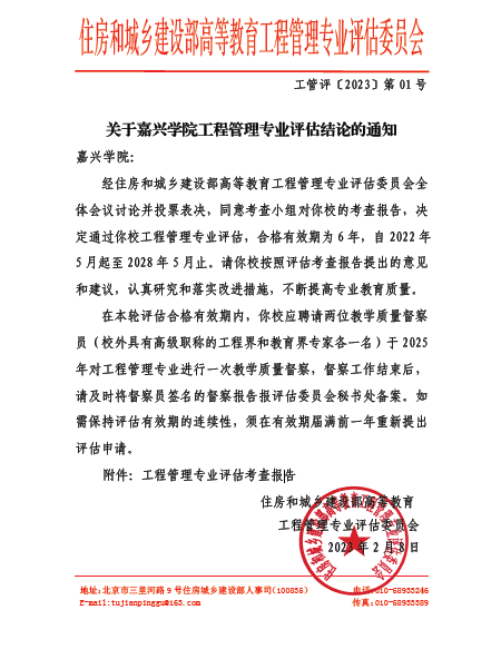 2023年2月8日,住房城乡建设部高等教育工程管理专业评估委员会公布了《关于嘉兴学院工程管理专业评估结论的通知》(工管评〔2023〕第01号),草莓视频 工程管理专业自2018年6月首次通过住建部组织的专业评估(认证)后再次通过了专业评估(认证),合格有效期为6年。通过专业评估(认证)意味着草莓视频 工程管理专业的人才培养质量得到了行业的认可,对草莓视频 工程管理专业人才培养与国际接轨、提升教育质量和专业影响力具有重要意义。