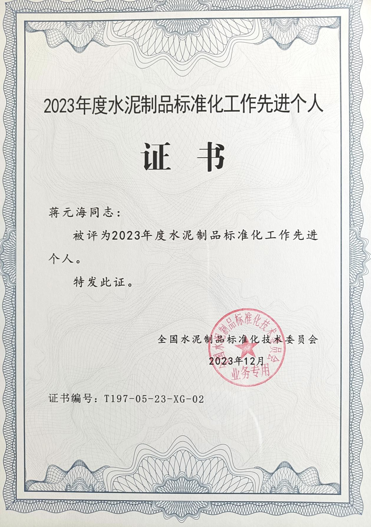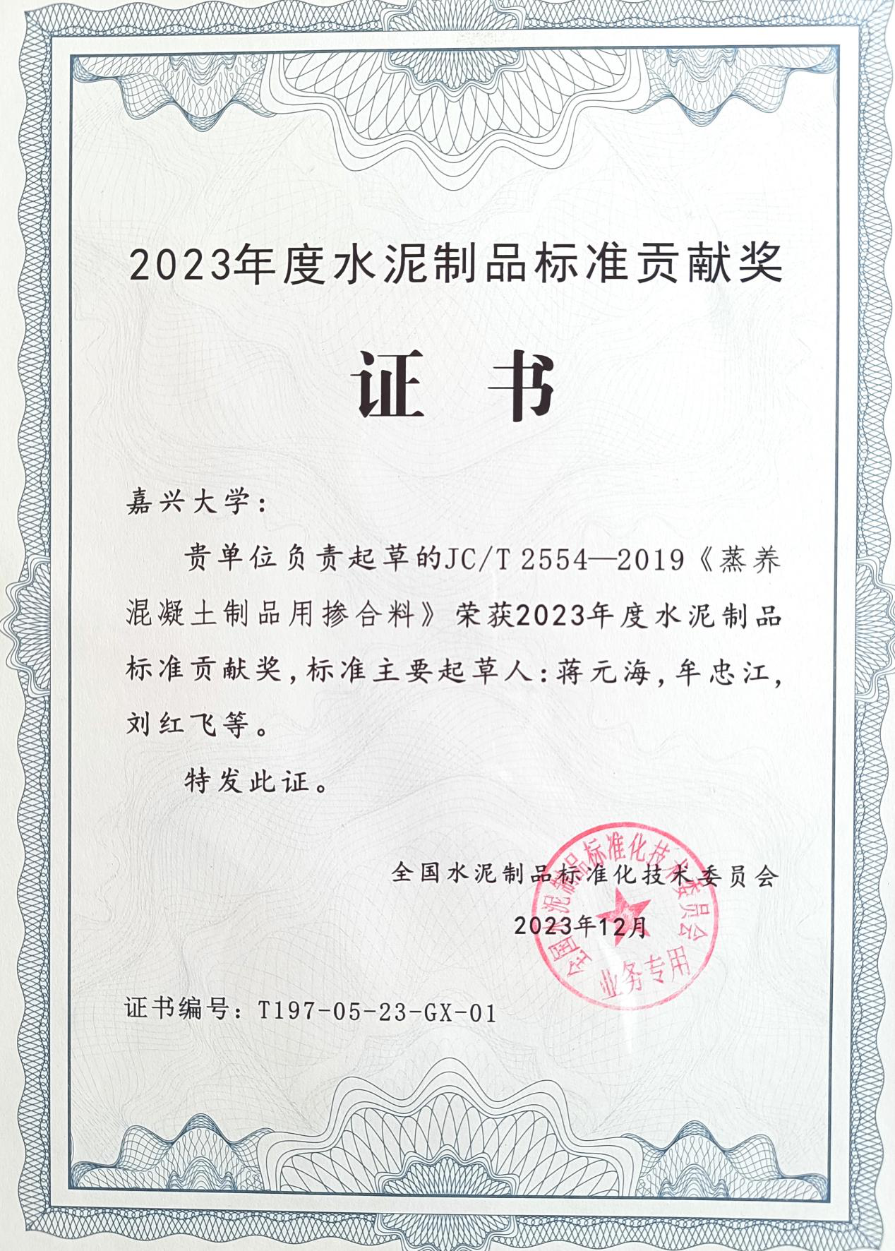 会议期间对2023年度全国水泥制品标准化领域的标准贡献奖、标准化先进个人和标准化先进集体等进行了隆重表彰。由我校负责起草的《蒸养混凝土制品用掺合料》行业标准(JC/T 2554—2019)成果荣获标准贡献奖 ,蒋元海老师荣获标准化先进个人。