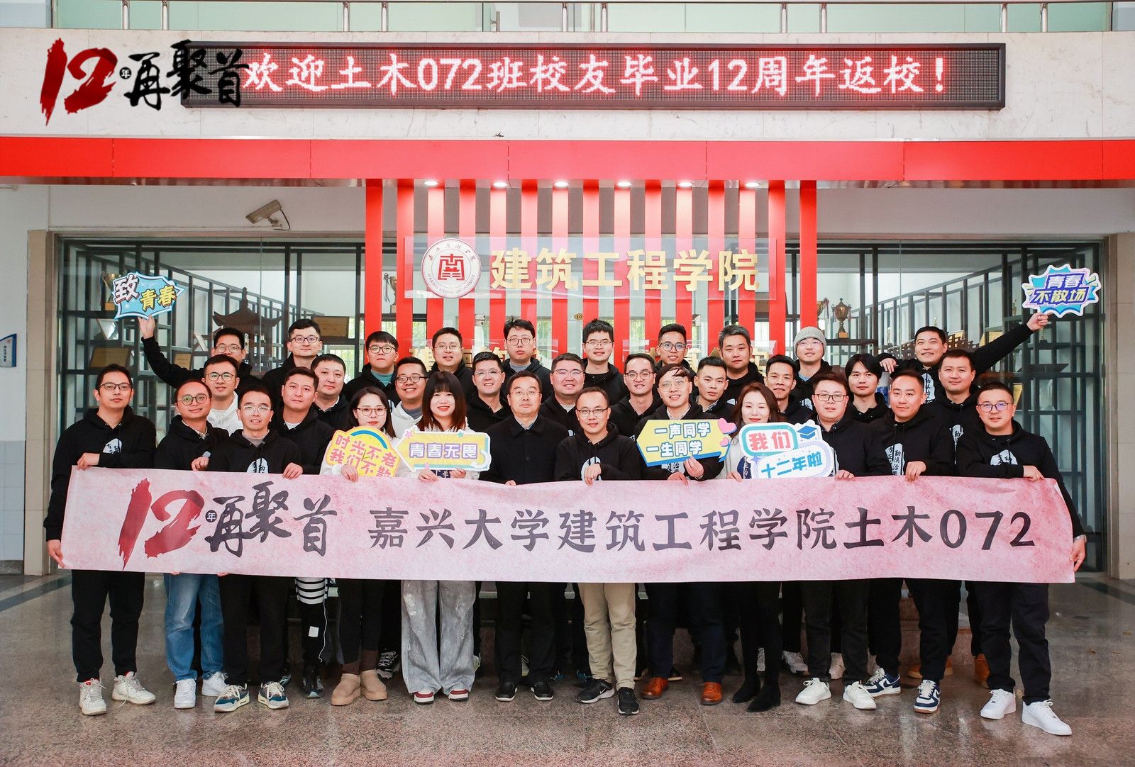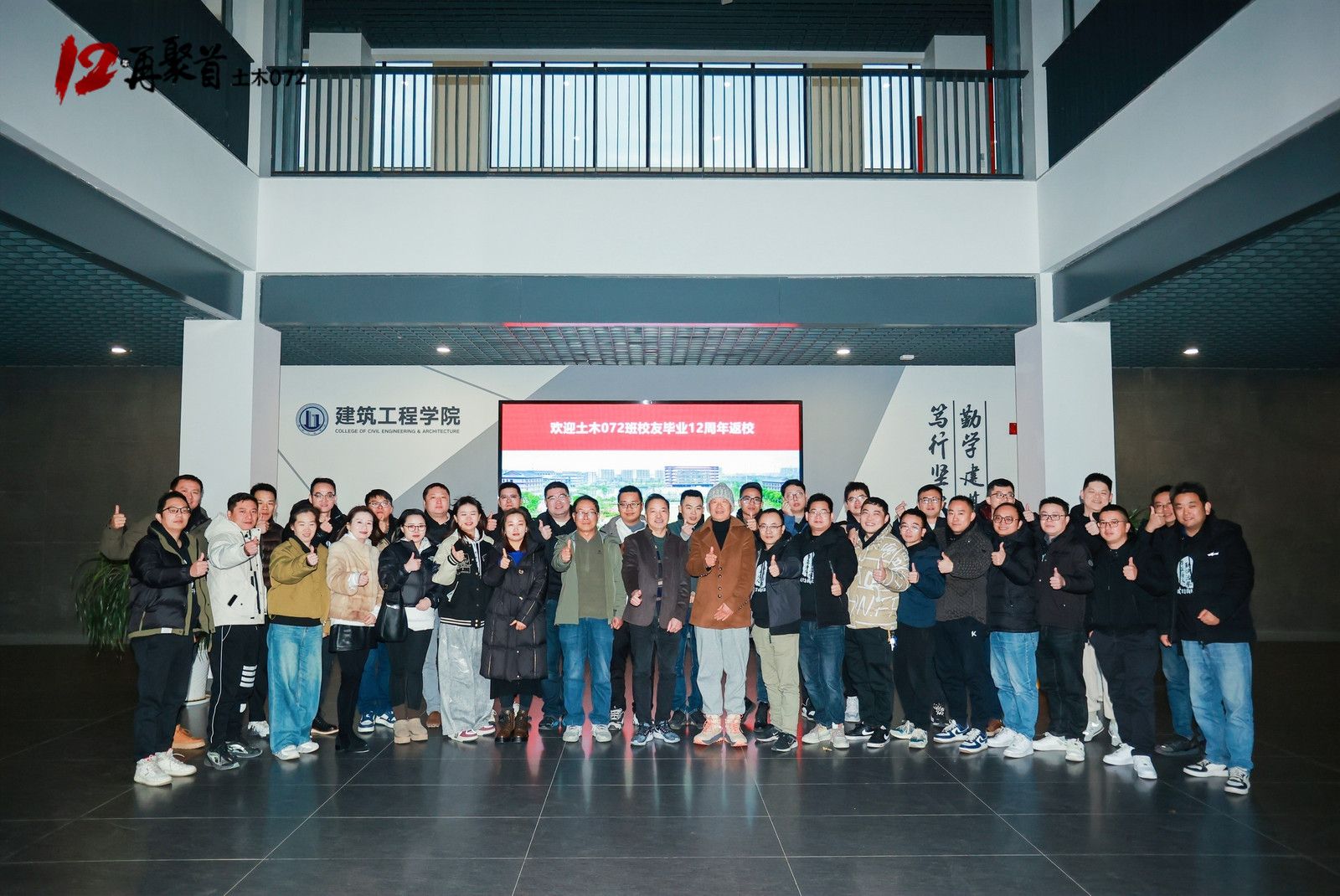 土木072班35名校友重返母校,共忆青葱岁月,畅叙师生情谊,共同纪念毕业12周年。学院党委书记姚民乐、党委副书记杨智慧、土木工程系主任赵全振、班主任金玉、老领导代表马嵘出席活动。