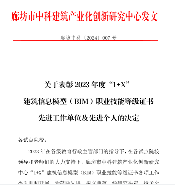 的“1+X(BIM)职业技能等级证书考核站点”荣获教育部2023年度"1+X"建筑信息模型(BIM)职业技能等级证书先进工作单位。廊坊市中科建筑产业化创新研究中心为教育部指定的“1+X”建筑信息模型(BIM)培训评价组织,近日发文授予草莓视频