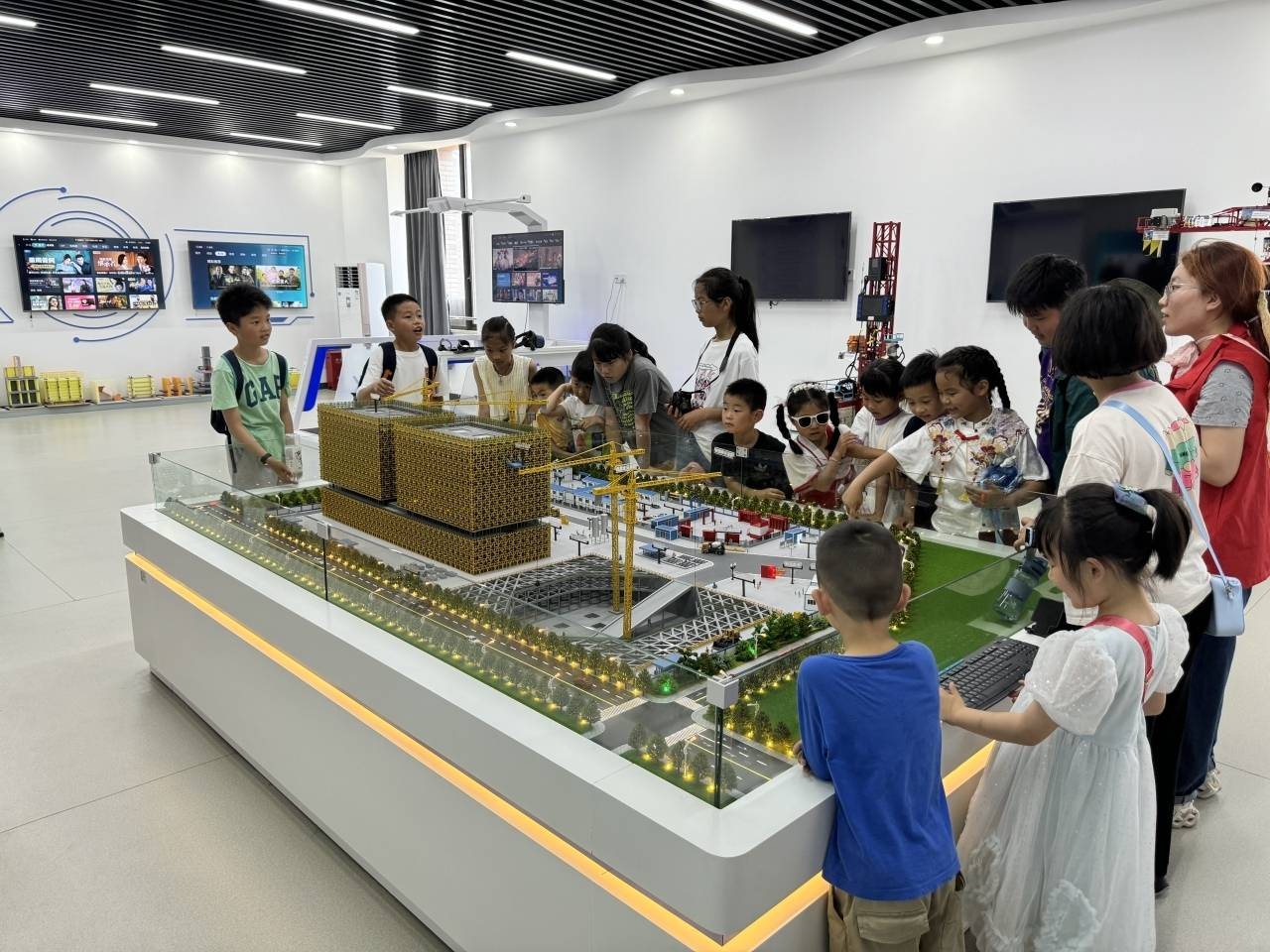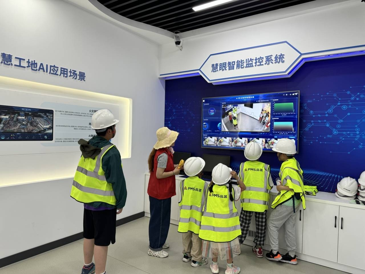 接着,小朋友们走进兴德北楼参观建工学院智慧智能建造中心,微观模拟建筑工程数字化系统与场景建筑工地。从入口的规范安全设施佩戴警示系统,到智能塔吊模型,再到整体智慧工地沙盘,每一个细节都展示了工程的神奇与魅力。孩子们也身临其境地感受未来建工的魅力,眼中闪烁着好奇与兴奋的光芒。