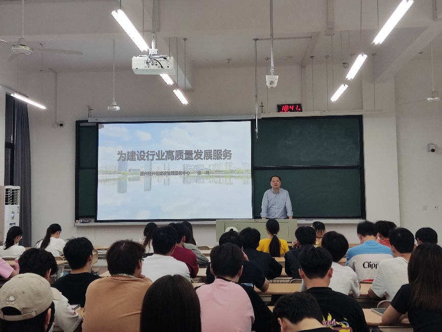 报告通过深入浅出的内容,从建设工程法律法规、招投标、工程质量管理以及创新、协调、绿色、开放、共享的发展理念等方面进行了生动的讲解,为师生们展现了建设行业的现状与未来的发展,分享了科学技术对建设行业的影响。