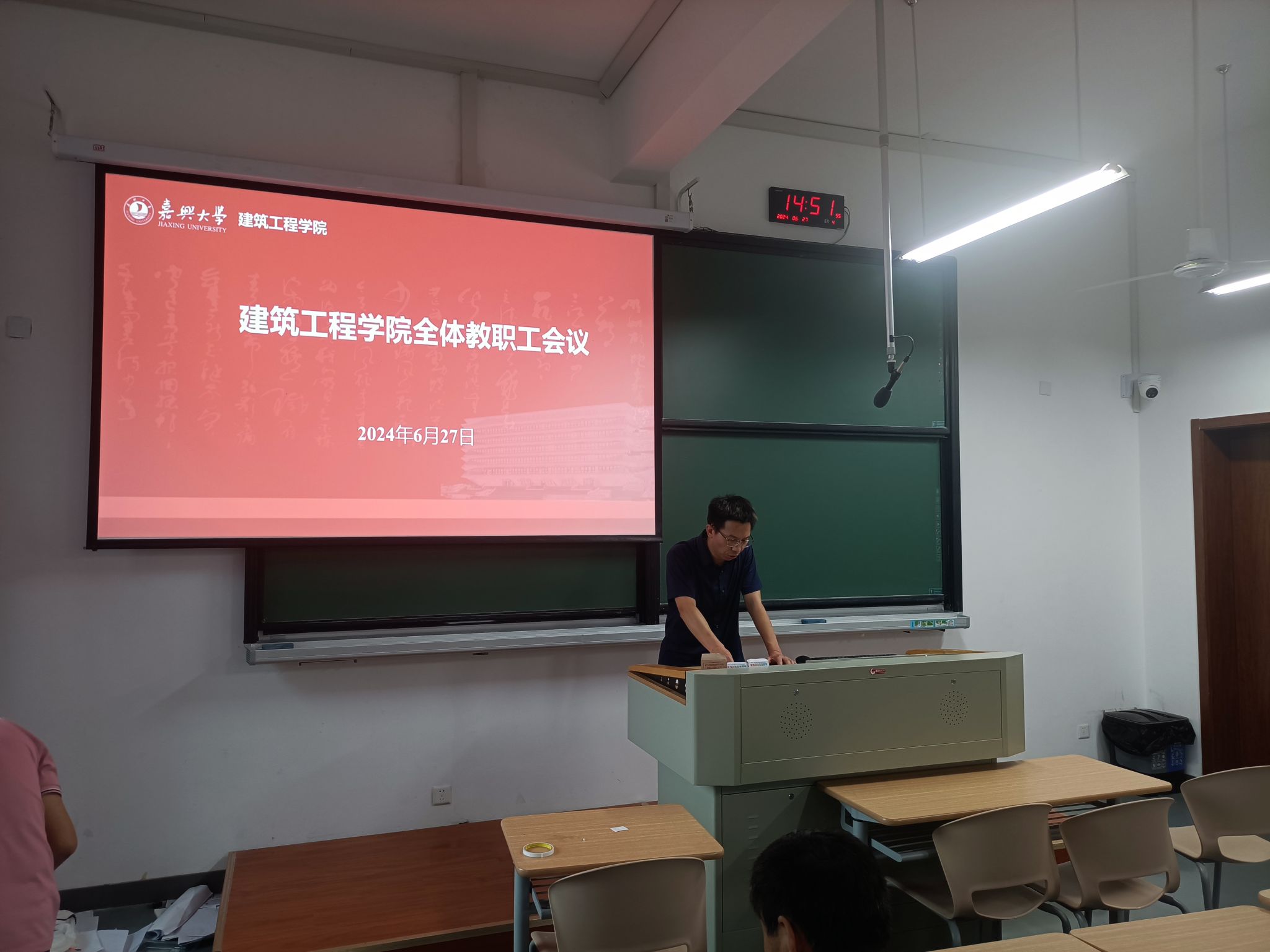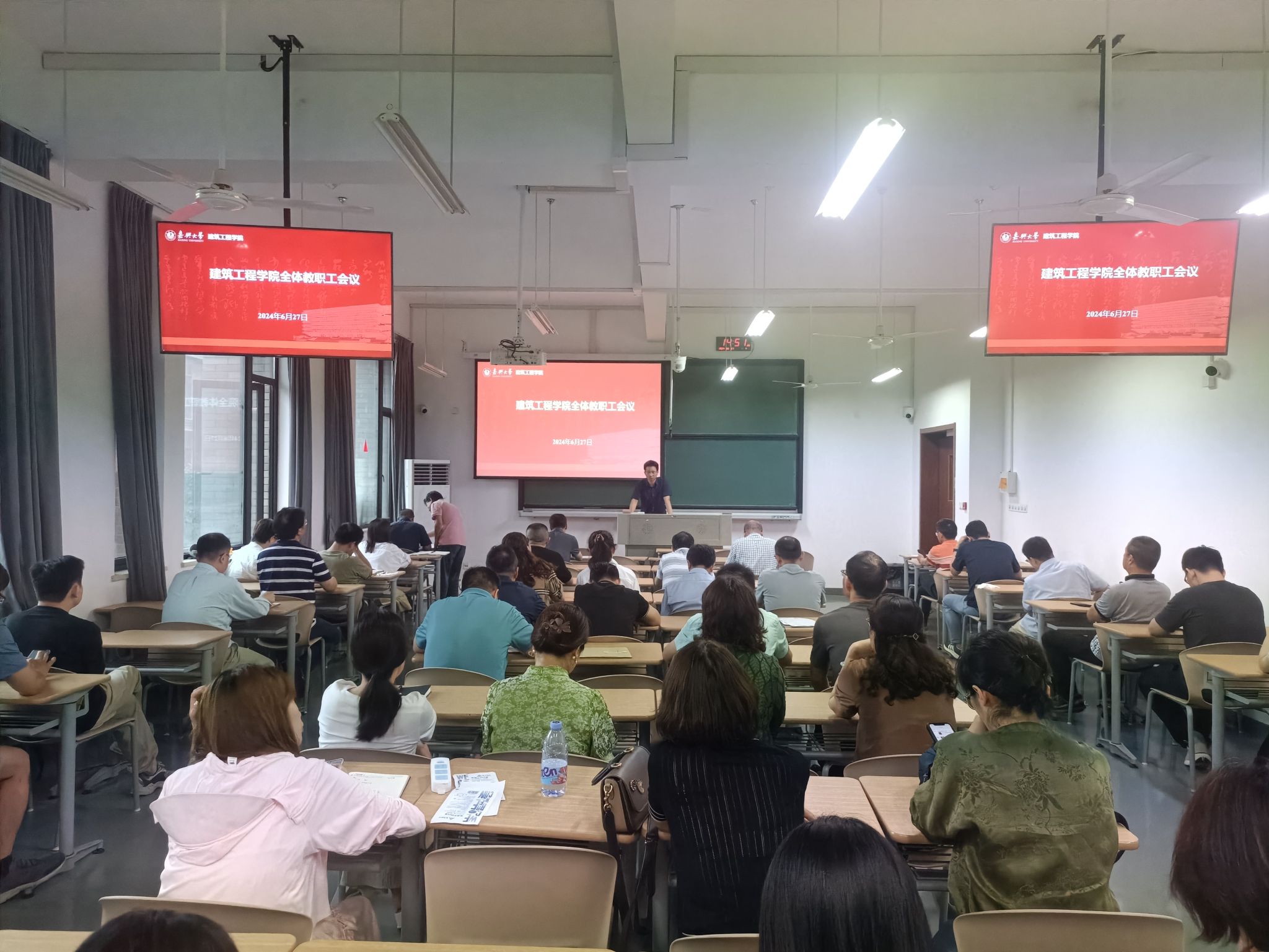 627午,建筑工程学院召开2024年上半年工作总结会。学院党政领导班子、全体教职工参加会议。会议由学院党委书记童勇军主持。陈华副院长、熊厚仁副院长、杨智慧副书记分别围绕各自分管条线对本学期教学工作、科研工作、学生管理、分工会等工作进行了总结回顾,对下一步工作进行了部署。