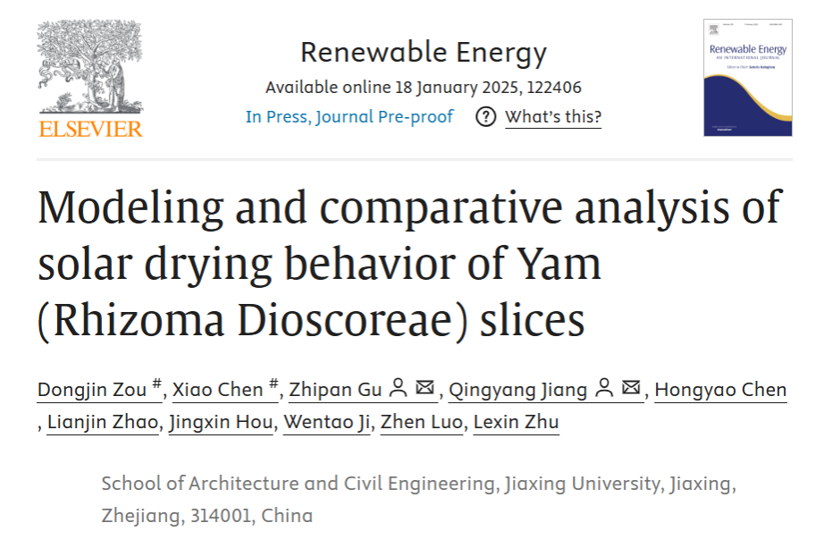 太阳能热泵科研团队谷志攀博士、江清阳博士题为“Modeling and comparative analysis of solar drying behavior of Yam (Rhizoma Dioscoreae) slices”(山药片太阳能干燥行为的模型与比较分析)的研究论文,在能源领域权威期刊Renewable Energy (IF=9.0,位列JCR和中科院一区TOP期刊)在线发表。通讯作者为谷志攀博士、江清阳博士,共同第一作者为草莓视频