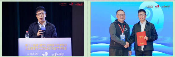 中国建筑学会副理事长沈立东为年会LOGO设计师中国建筑学会室内设计分会常务理事、山东建筑大学艺术学院院长陈淑飞,中国建筑学会室内设计分会理事、杭州意内雅建筑装饰设计有限公司创始人朱晓鸣颁发特别感谢证书,表彰其创意团队为年会打造了独特而深刻的视觉记忆。