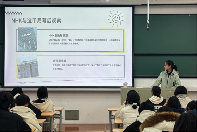 分享会上,贾舒婷(工管242班)和侯鹏辉(工管231班)两位同学率先分享了他们暑期在日本大阪大学研学的精彩经历。他们详细介绍了丰富的课程安排、深度的文化体验以及难忘的实地见闻。两位同学均表示,此次研学不仅显著提升了日语口语能力,更锻炼了独立解决问题的能力和面对突发情况的应变能力。