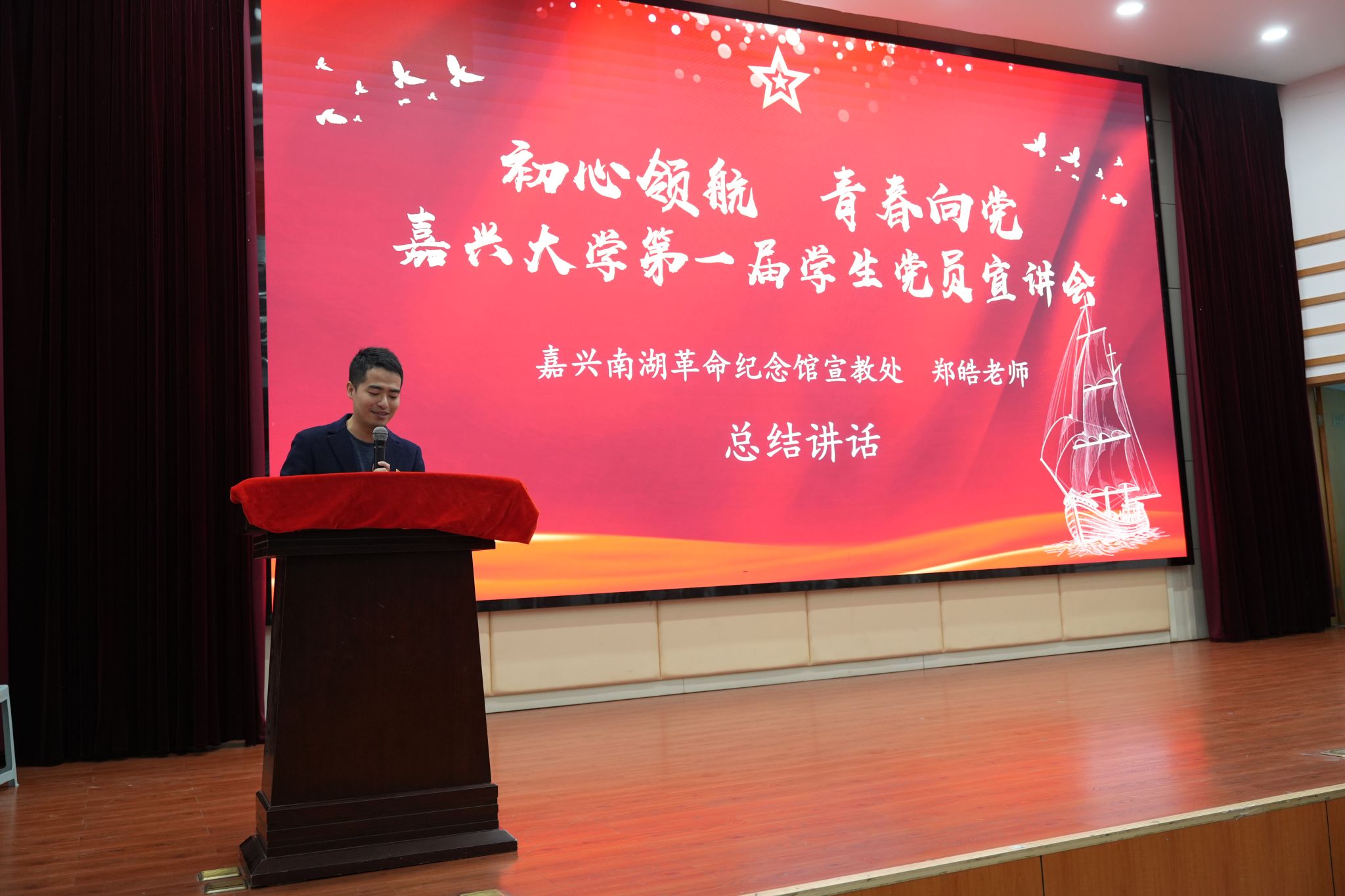 在宣讲会的最后,嘉兴南湖革命纪念馆宣教处郑皓老师为大家做点评。他表示,本次宣讲会通过精彩纷呈的演绎,充分展示了各学院丰富多彩的党建活动。学生党员通过宣讲,展示了党的奋斗历程与辉煌成就,在大家生动的语言和动作中,充分展现了青年学子朝气蓬勃、积极向上的精神风貌。他希望参与本次宣讲会的每一位同学,奋发学习、坚定信仰,主动担当起历史赋予新时代青年的责任和使命,以更加饱满的热情,投身到祖国的建设中去,为实现中华民族伟大复兴的中国梦而不懈奋斗。