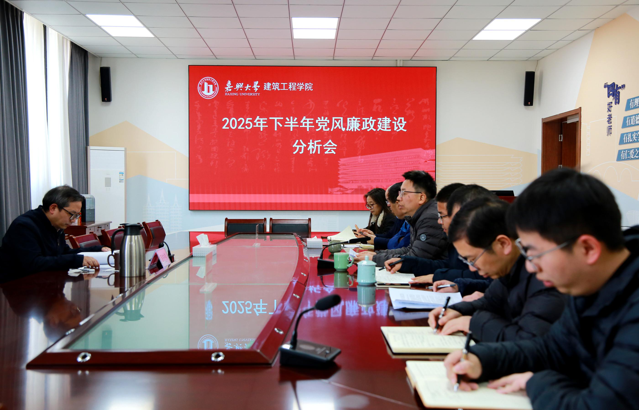 在兴德北楼 512 会议室召开 2025 年下半年党风廉政建设情况分析会。副校长周宏伟到会指导。学院党政领导班子成员、学术院长、党委委员、综合办公室主任及组织员等参加会议。会议由学院党委书记童勇军主持。