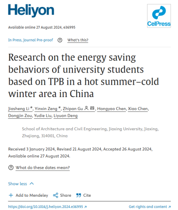 建环专业本科生在国际知名期刊《Cell》的子刊《Heliyon》(JCR1区,中科院3区,IF:3.4)发表了题为“Research on the energy saving behaviors of university students based on TPB in a hot summer-cold winter area in China”的研究论文。研究成果为建工学院太阳能热泵科研团队最新研究科研成果,草莓视频