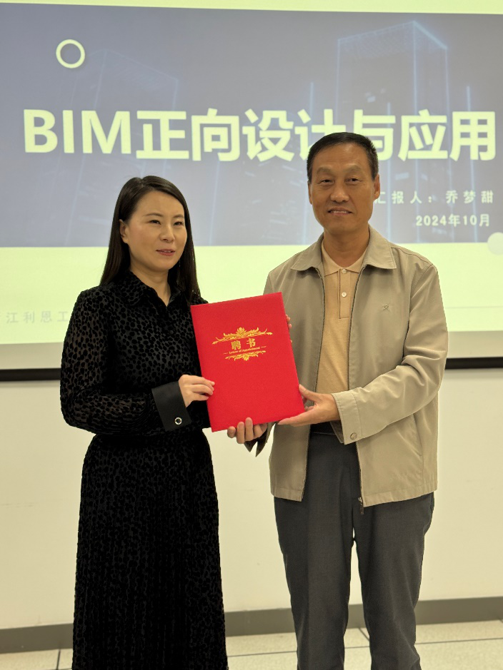 举办“建工大讲堂”第五期学术交流,本次大讲堂特邀浙江利恩工程设计咨询有限公司副总经理、高级工程师乔梦甜做主题为“BIM正向设计与应用”的学术报告。在学术报告开始前,王恩茂院长为其颁发客座教授聘书。受聘仪式结束后,工程管理系主任宋宇名主持会议,全院60余名师生到场聆听。