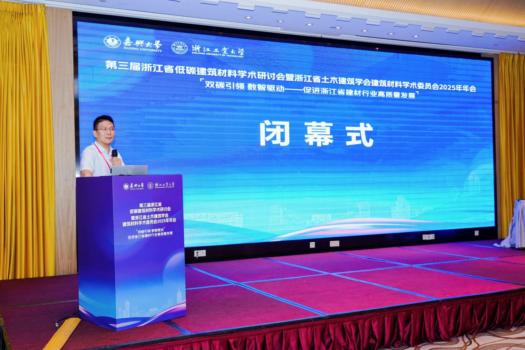 闭幕式上,浙江省土木建筑学会建材分会秘书长做总结报告。孔德玉教授表示,本次大会取得圆满成功,由衷感谢浙江省土木建筑学会的悉心指导,以及主办单位、承办单位与协办单位的大力支持,同时也得益于众多相关企业的积极参与和贡献。愿此次会议的精彩报告能为与会嘉宾带来启发与收获。展望未来,期待各方继续携手同心,汇聚智慧与力量,共同构建既契合国家战略导向、又彰显浙江特色的绿色低碳建材科技创新体系与现代化产业体系,为建筑领域“双碳”目标的实现提供坚实支撑。