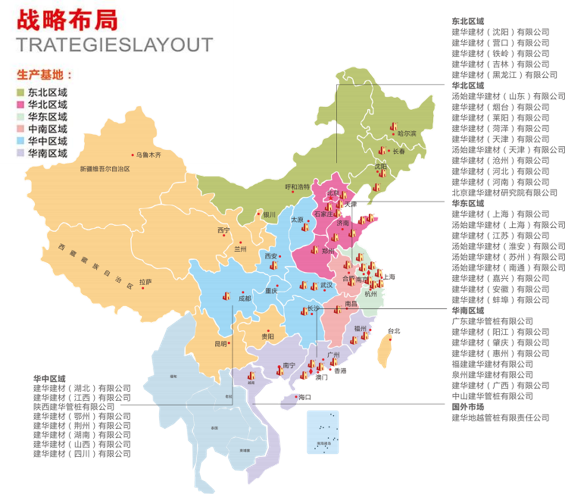 建华建材集团,混凝土制品与技术综合服务商,国家住宅产业化基地,创建于 1992 年,其前身 是建华管桩集团。截止到 2022 年 7 月,建华建材集团在全国成立并投产了 70余 处生产基地。全国设有 300+个销售服务网点,集团员工近 3 万人。2012 年在越南成立首家海外生产基地,2018 年 1 月集团在越南成立第二家海外生产基地,目前,建华建材通过沿海沿江生产基地自建码头,产品销售可覆盖东南亚及周边各国。